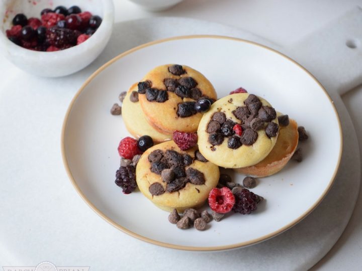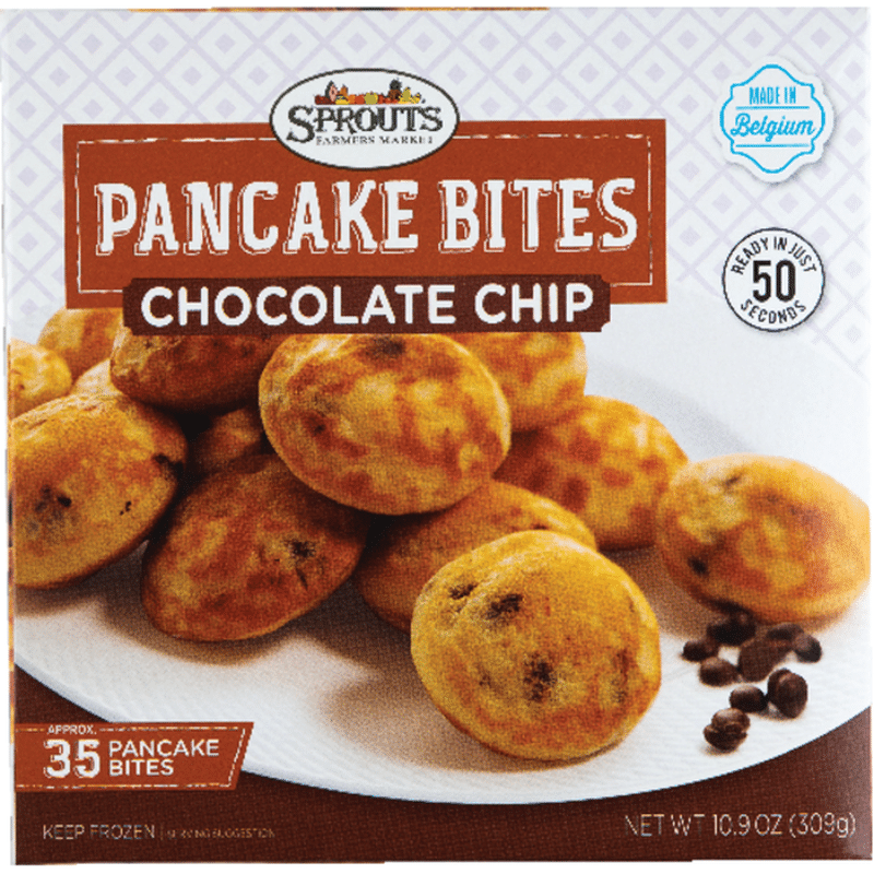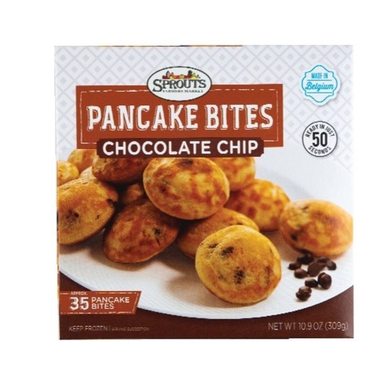 Chocolate Chip Pancake Bites Chocolate Chip Pancake Bites : Cocoa, chocolate chips, baking mix, pancakes, milk, water.